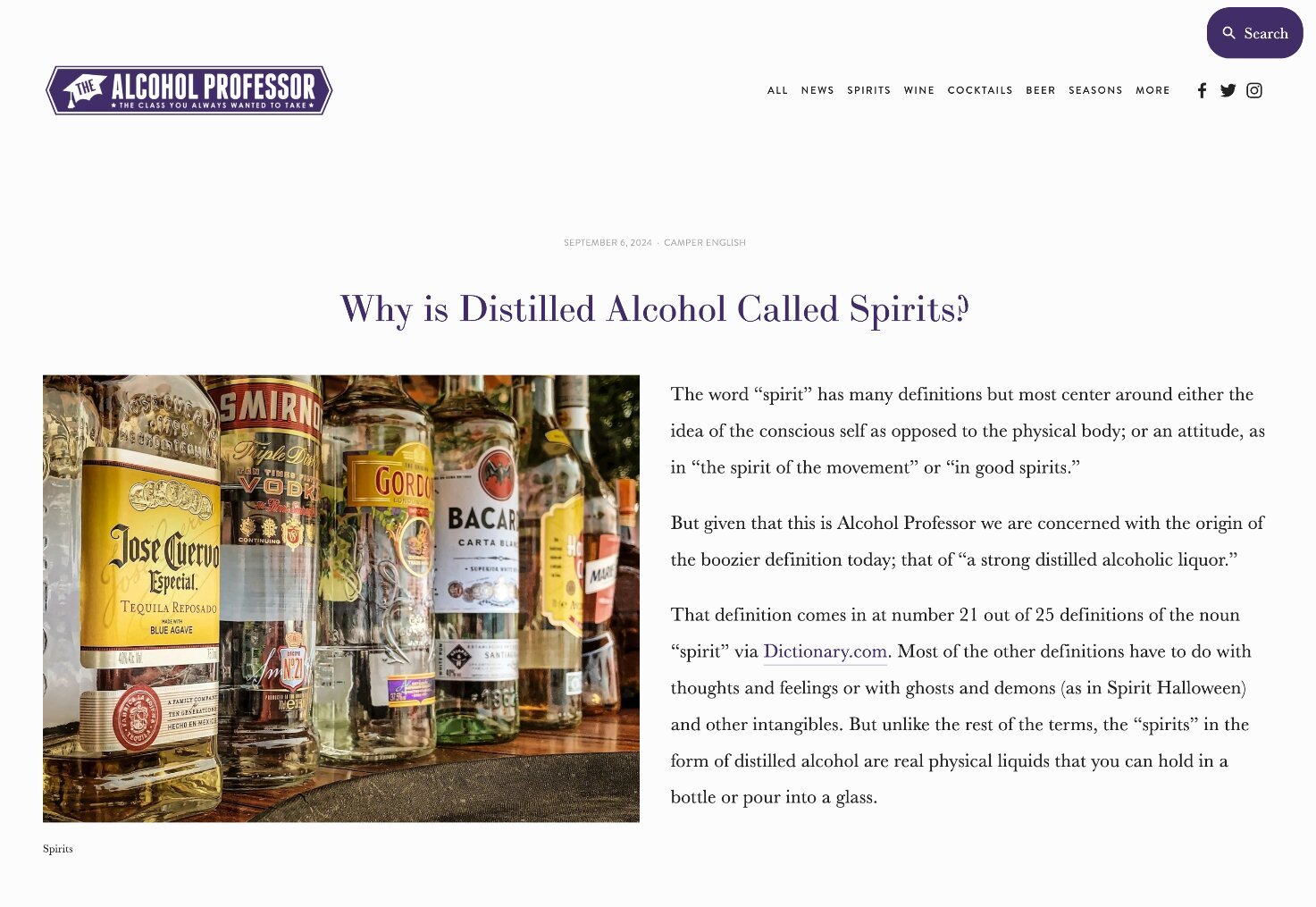 That definition comes in at number 21 out of 25 definitions of the noun “spirit” via Dictionary.com. Most of the other definitions have to do with thoughts and feelings or with ghosts and demons (as in Spirit Halloween) and other intangibles. But unlike the rest of the terms, the “spirits” in the form of distilled alcohol are real physical liquids that you can hold in a bottle or pour into a glass.