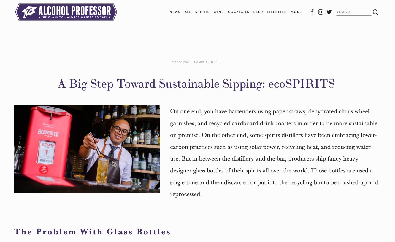 For AlcoholProfessor.com, I wrote up EcoSpirits, a company with a system for avoiding single-use glass bottles sold to bars. I've been following them for years and am psyched they've set up locations in the US now.