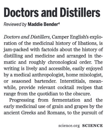 I'm so thrilled that Science wrote a review of Doctors and Distillers. Science is one of the most important academic journals in the world, and if you're a scientist it is a career goal to get into the publication. I didn't get in for doing any science, but for writing about the history of science. I'll take it!