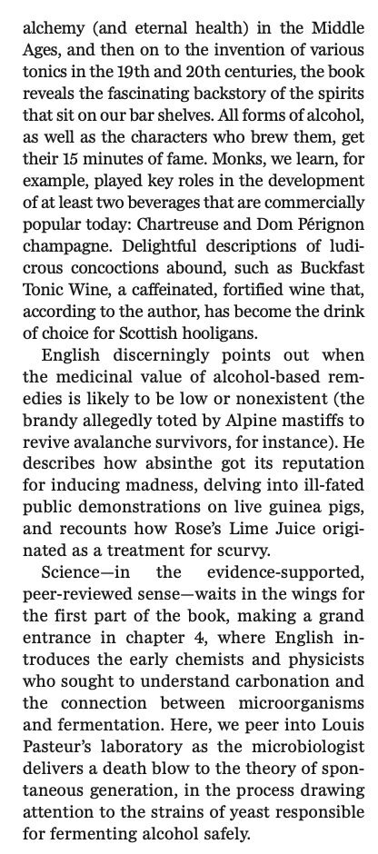 and recounts how Rose’s Lime Juice originated as a treatment for scurvy.Science—in the evidence-supported, peer-reviewed sense—waits in the wings for the first part of the book, making a grand entrance in chapter 4, where English introduces the early chemists and physicists who sought to understand carbonation and the connection between microorganisms and fermentation. Here, we peer into Louis Pasteur’s laboratory as the microbiologist delivers a death blow to the theory of spontaneous generation, in the process drawing attention to the strains of yeast responsible for fermenting alcohol safely.