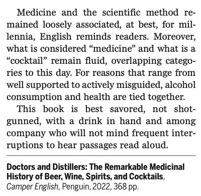 It is still six weeks before the publication date of Doctors and Distillers (July 19, 2022) but it has already achieved my ultimate goal of critical success.