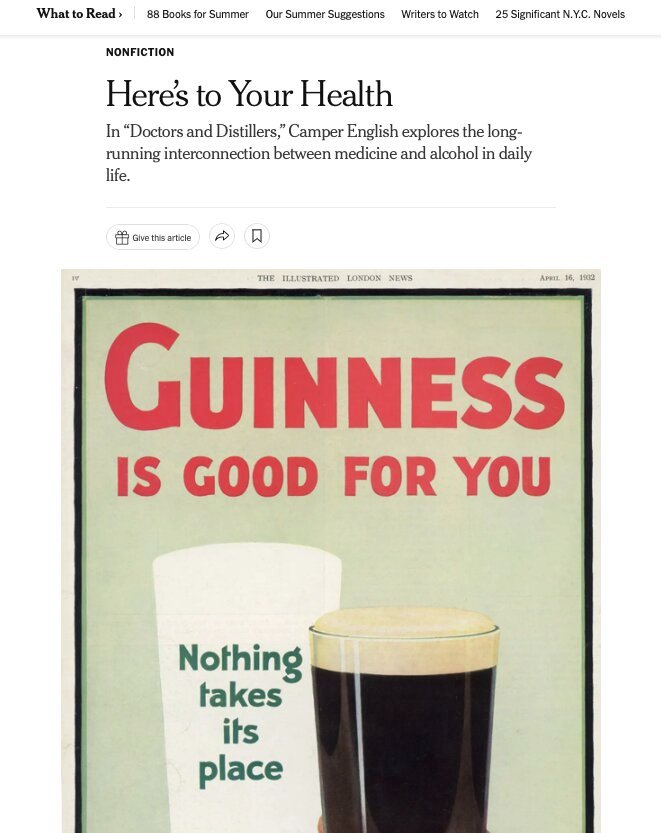 In “Doctors and Distillers,” English, a San Francisco-based cocktails and spirits writer, has collected many similar stories of alcoholic beverages used as treatments for what ails the mind and body. It’s a mostly chronological journey through major milestones, spanning the B.C. days of fermented Chinese rice drinks and therapeutic wine use during the Indian Vedic period, to the 21st century: “In Ireland, the practice of giving blood donors a free pint of Guinness only ended in 2009.”