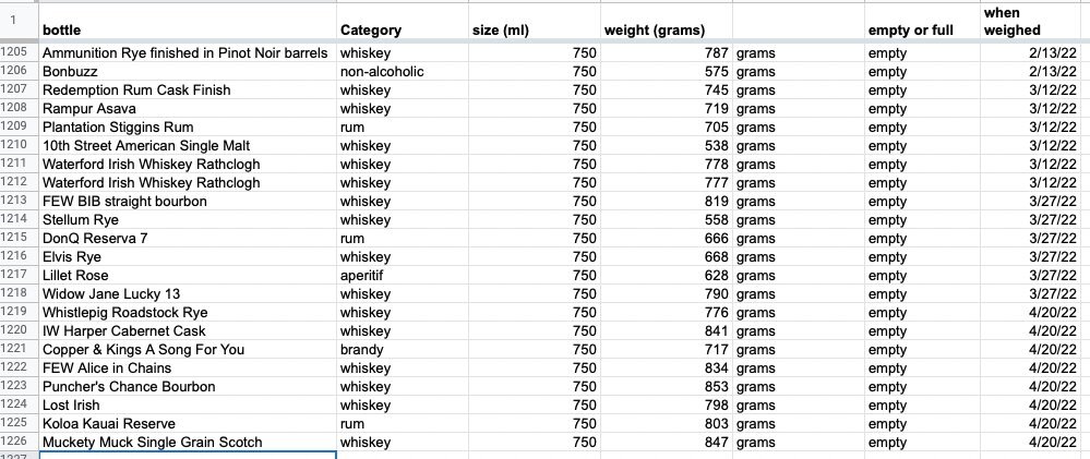 Since 2009 I have been weighing liquor bottles before recycling them. I was up to 1226 bottles weighed and decided it was about time for me to analyze the data.