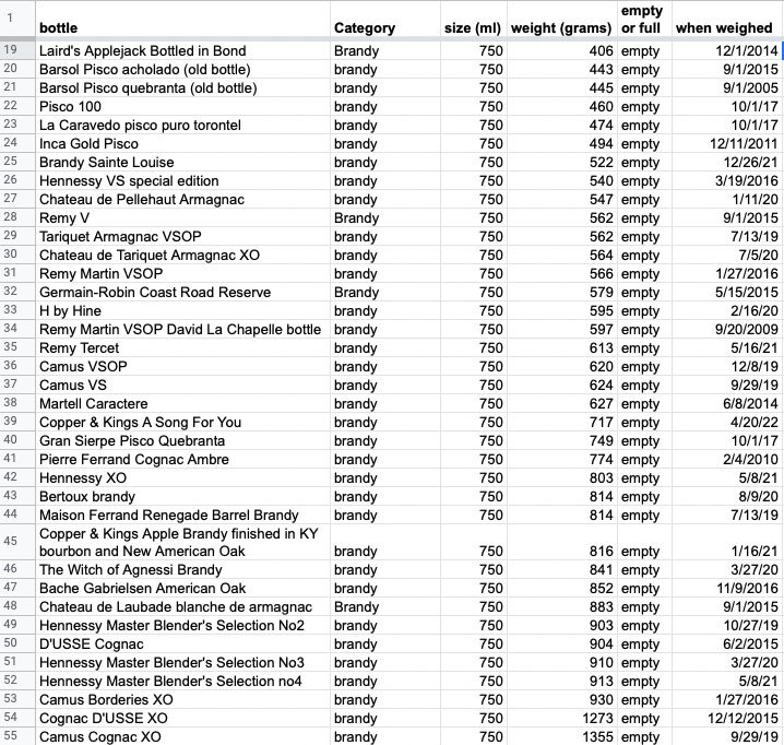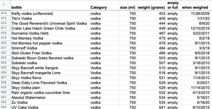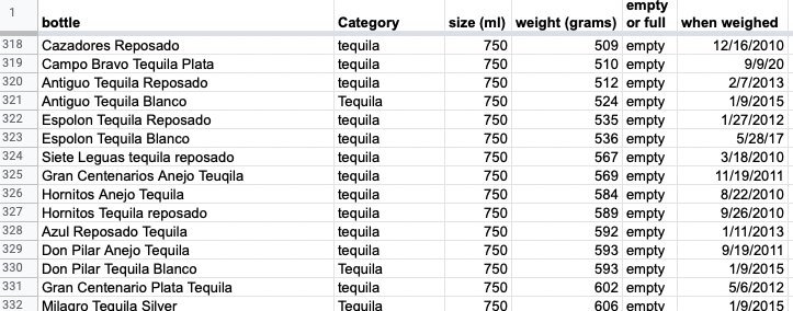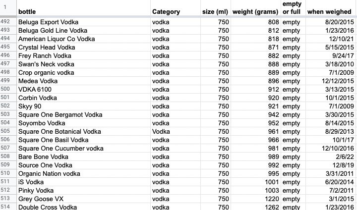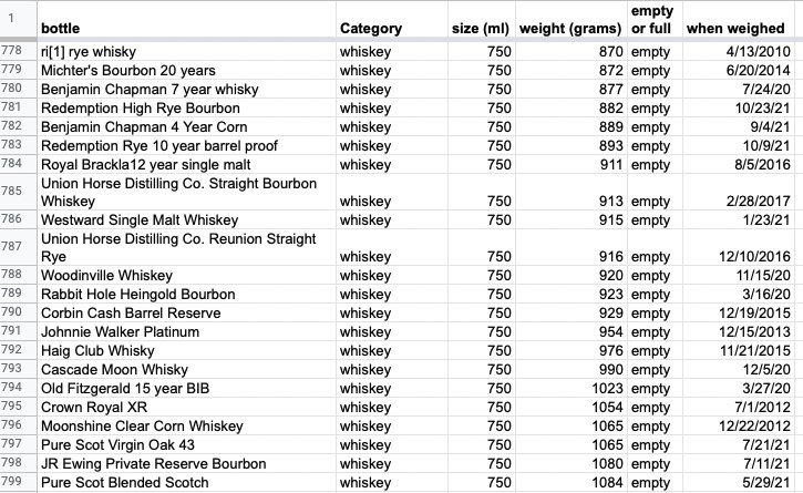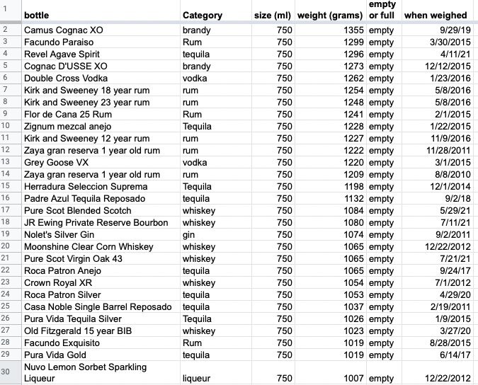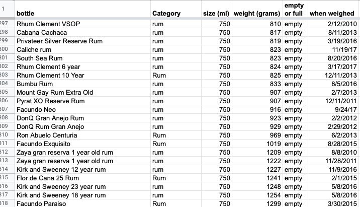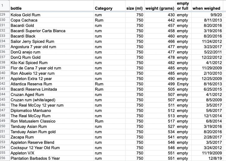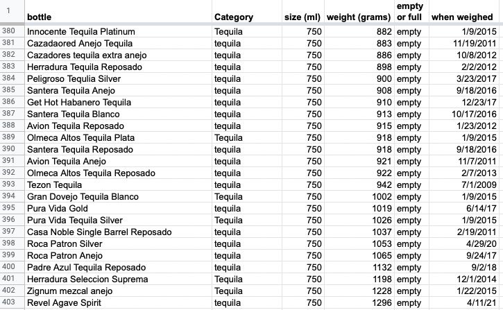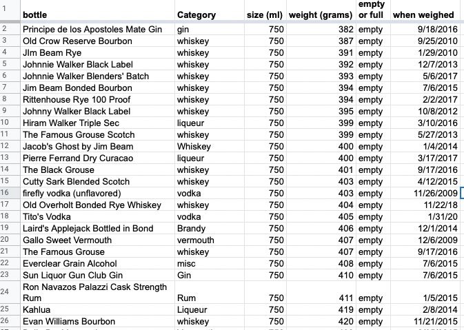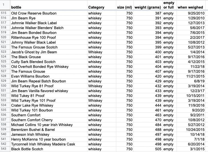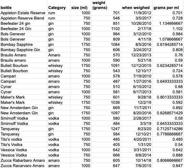 This data obviously doesn't include every bottle on the market, and there may be some mistakes in it, such as a typo when I was putting in weights or I didn't weigh the box/tube that a scotch whiskey came in, etc. So take it with a grain of salt.