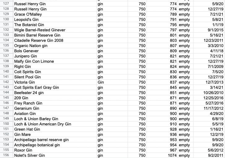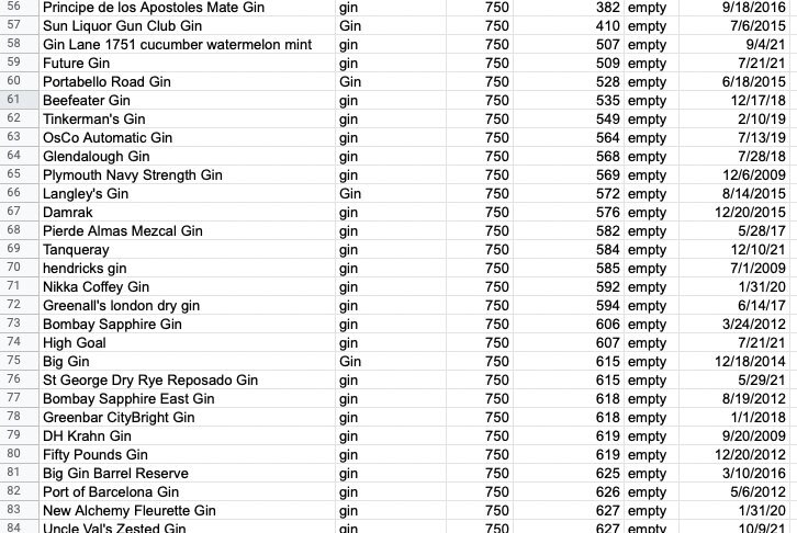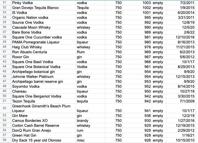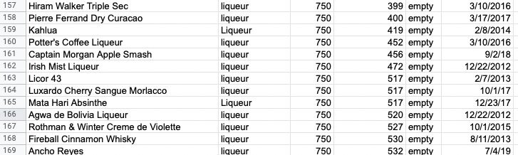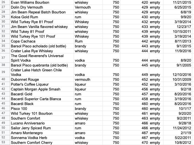 There are repeats of bottles, for example a flavored vodka versus the unflavored, and different ages of some whiskies, but I kept those in on purpose.