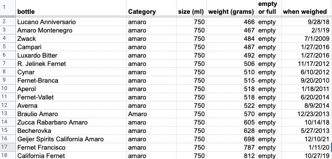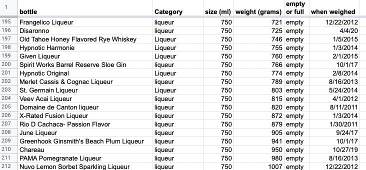 At the bottom of the post I'll include a link to my spreadsheets. Note that I dated when I weighed the bottles because bottles often change. In my final analysis I took only the more recent bottle weights if I had them, but it's likely that some of the data in my spreadsheet represents older bottles that have since been changed.