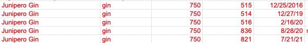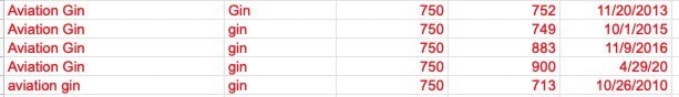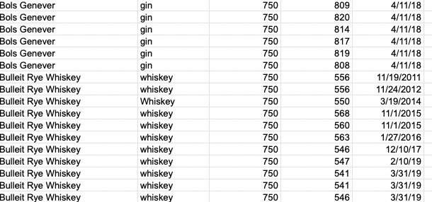 I then reduced the data down to avoid repeats, and to only include 750ML bottles so I was comparing apples to apples (or rather, applejack to applejack).