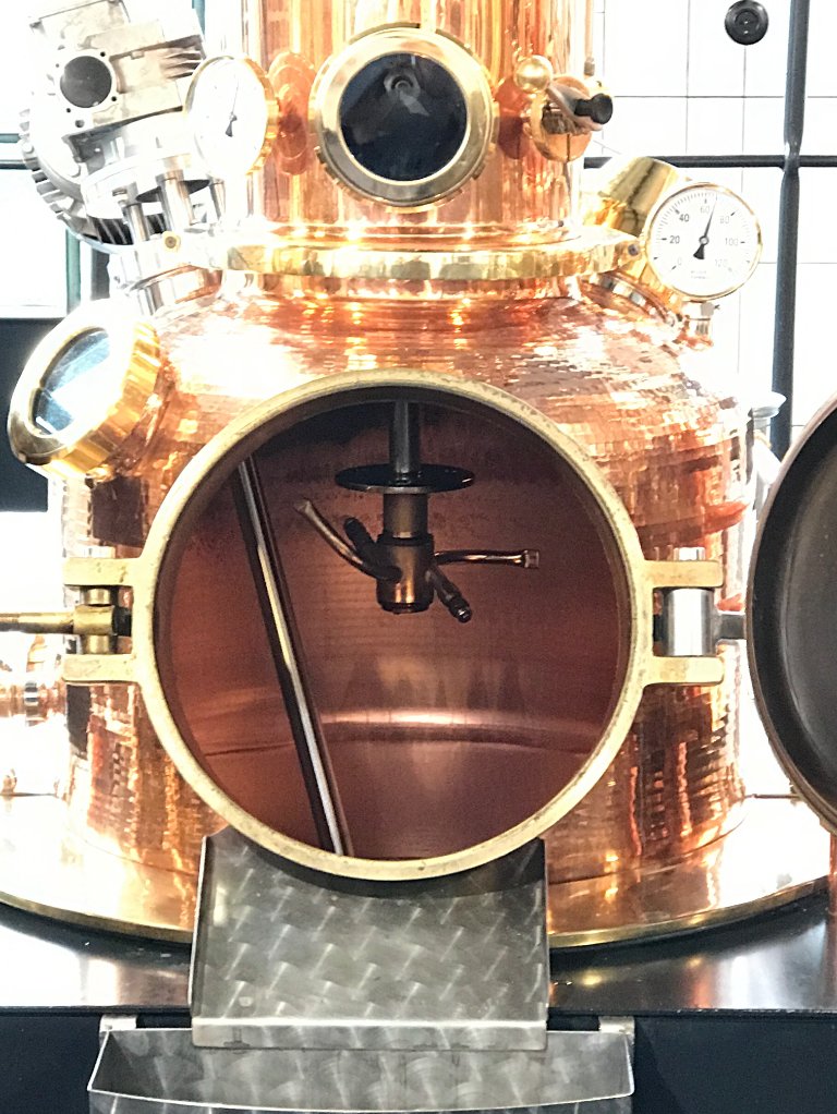 After being distilled, the spirit at full proof is rested for 90 days in these large urns before being diluted and bottled. The dilution process, which takes place at the bottling plant, is slow and takes place over 10 days. The product is bottled at 47% ABV, which is above the level that it would louche, so the gin is not chill-filtered.