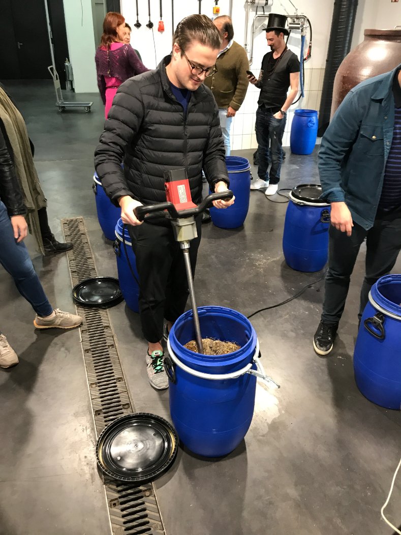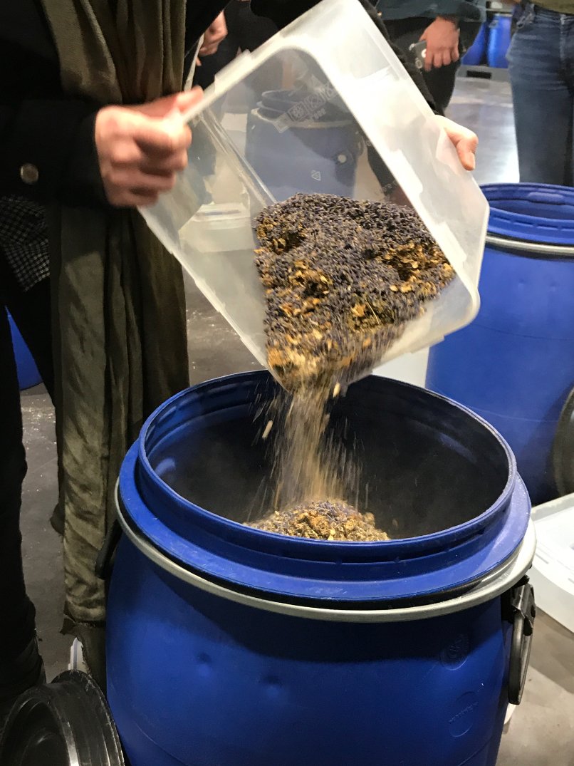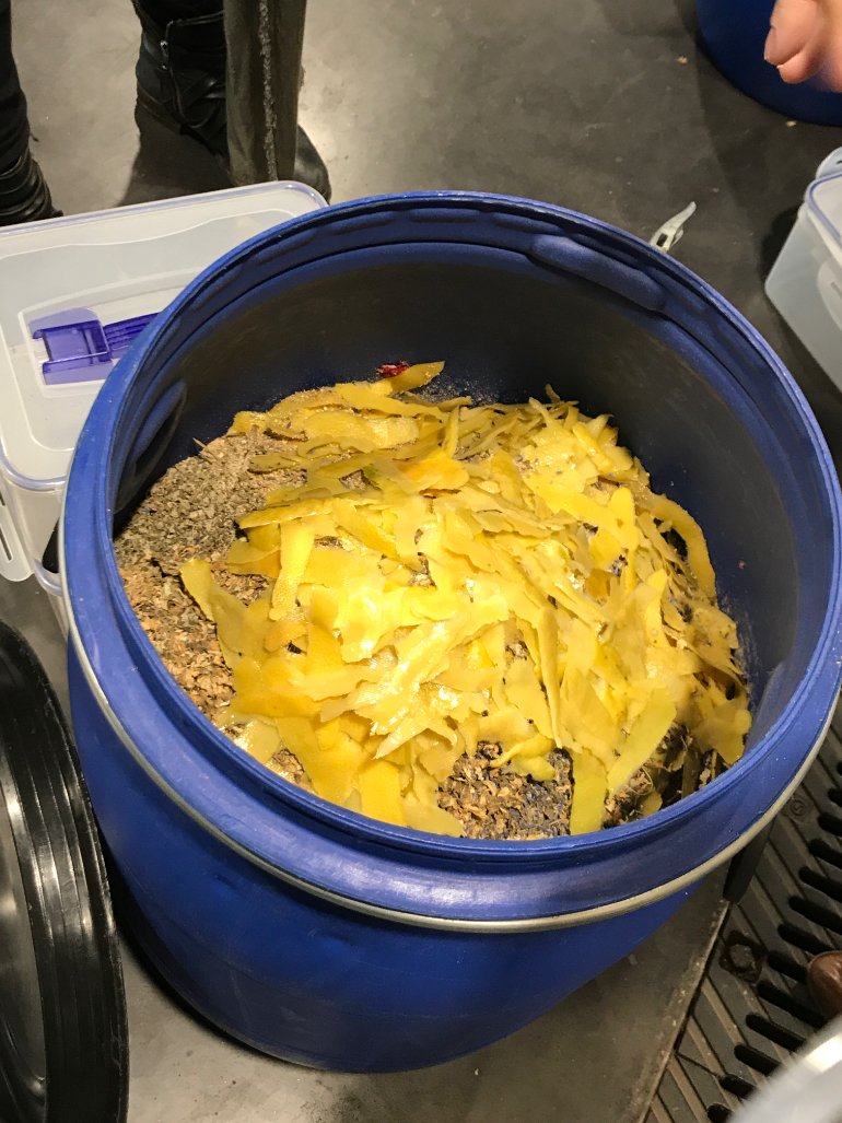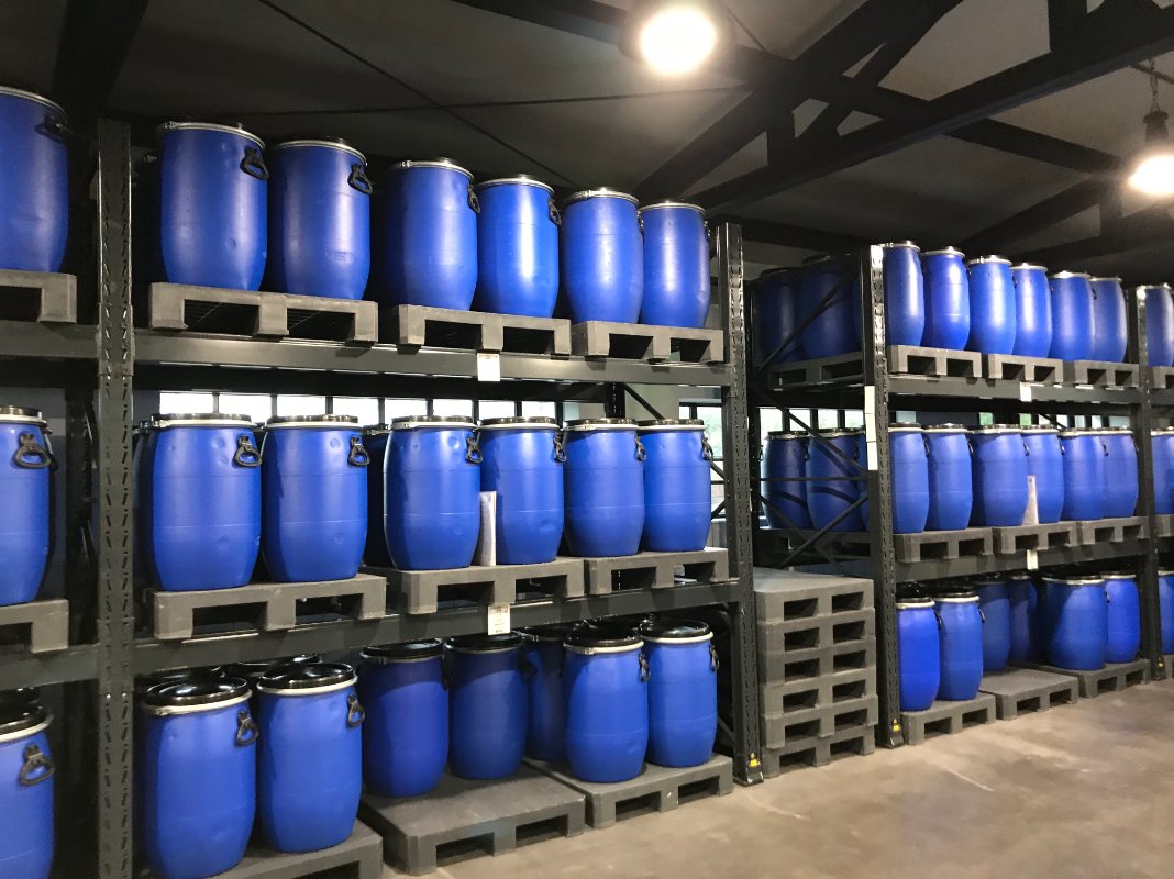 Each of the blue barrels makes 120, 500ml bottles of gin. Each barrel has about 25 liters of alcohol in the 60L bucket- they're not filled all the way.