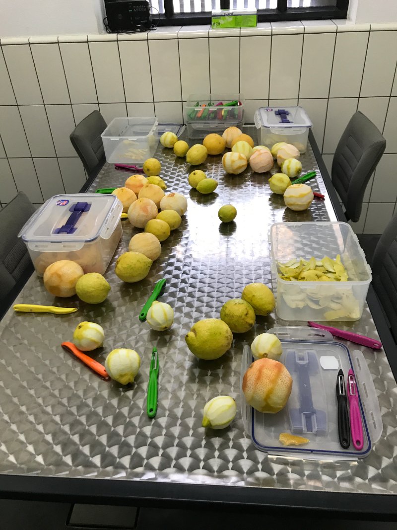 • They use fresh peeled grapefruits and lemons- no pith. They eat the grapefruits and some of the lemons are used to make biogas.