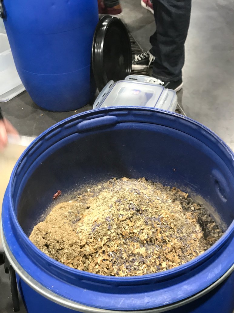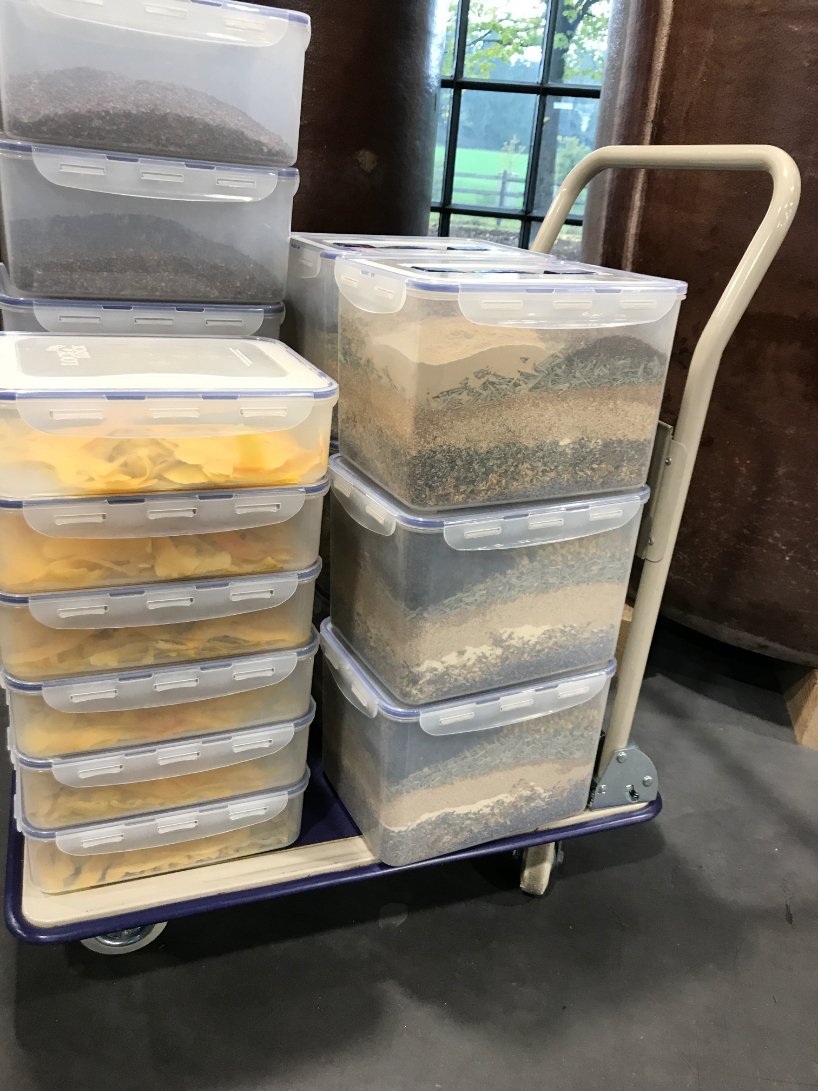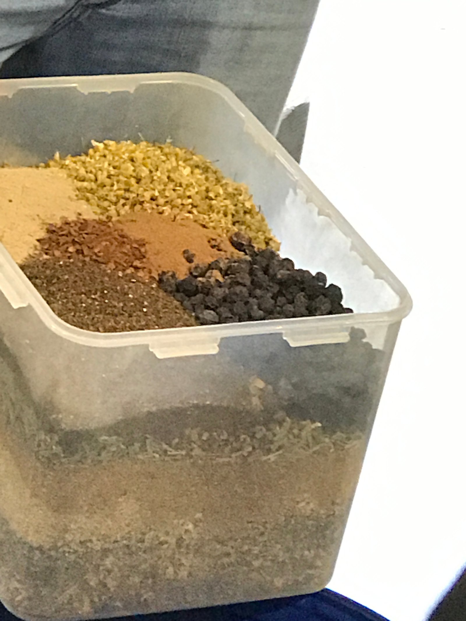 • Ground botanicals are stored in plastic boxes until use.