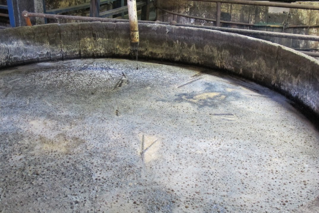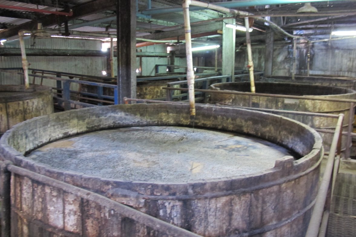 To the molasses, water and nutrients are added to help with good fermentation. Fermentation for their light rums takes 30-36 hours. It's longer for their heavier rums, as that long fermentation allows flavors to build up. They can use the same fermented molasses (molasses beer) for their light marques distilled in pot and column stills, but use a different molasses beer for the heavy pot still rum. They have 24 open-top fermenters.