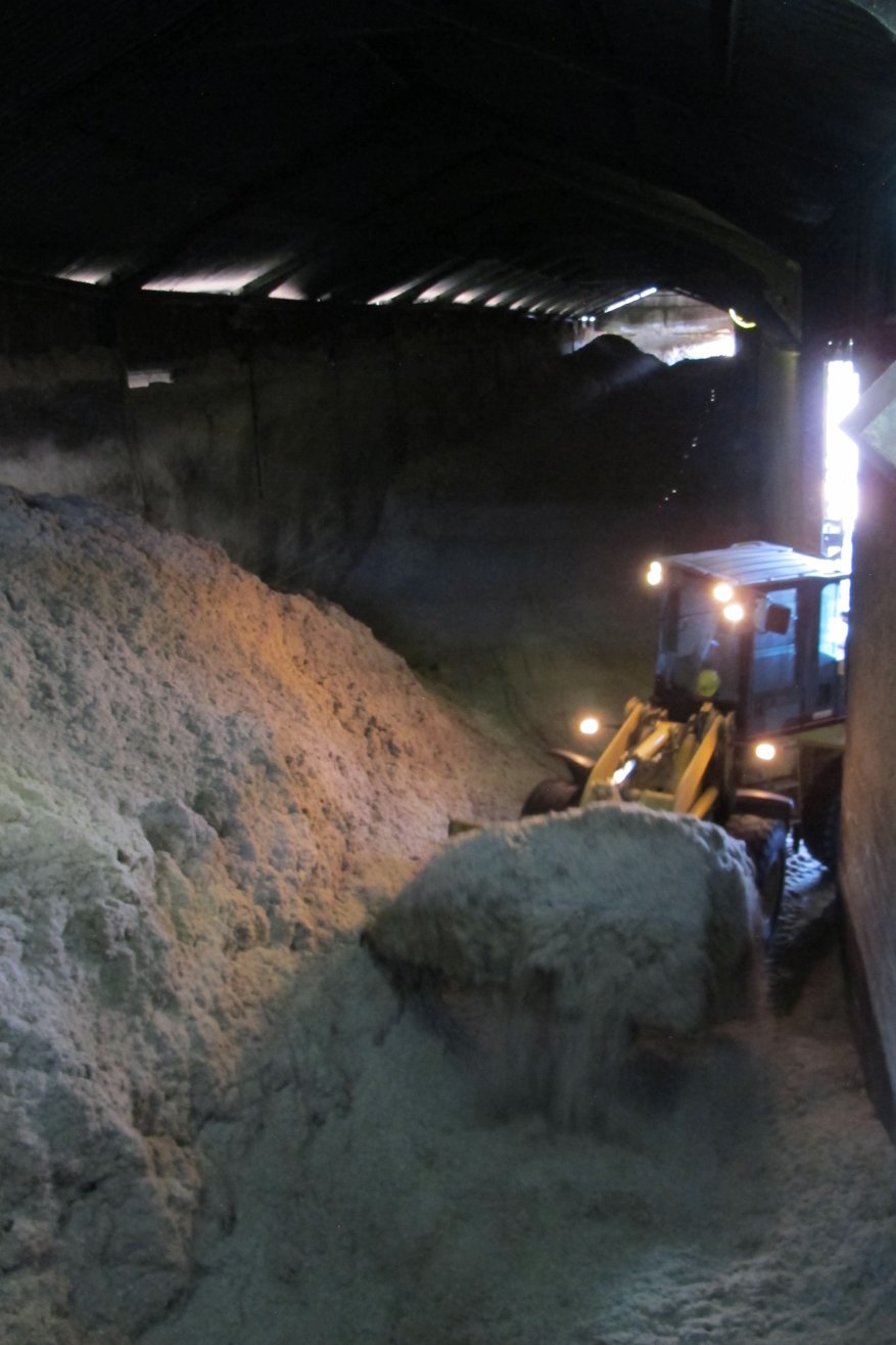 The bagasse (solid bits) leftover are used to heat the boilers on-site, right after juice extraction. The leftovers are piled up in huge pile to be used later.