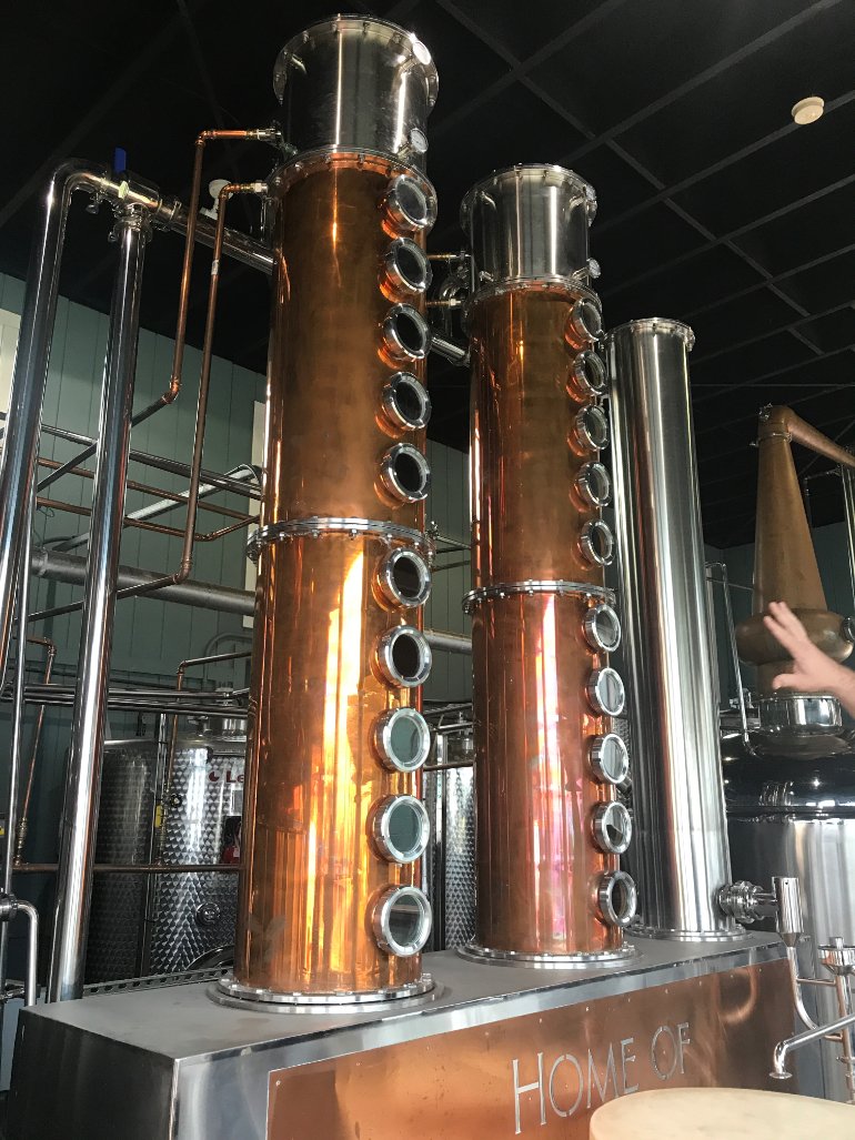 The cane wine is distilled in the bulb cap helmet still named "The Brain" (the other pot still, their original one, is named "Pinky") then flows through just one column afterward that has only three plates in it. (This is a discontinuous hybrid still set-up. They were planning to experiment with double pot distillation.)