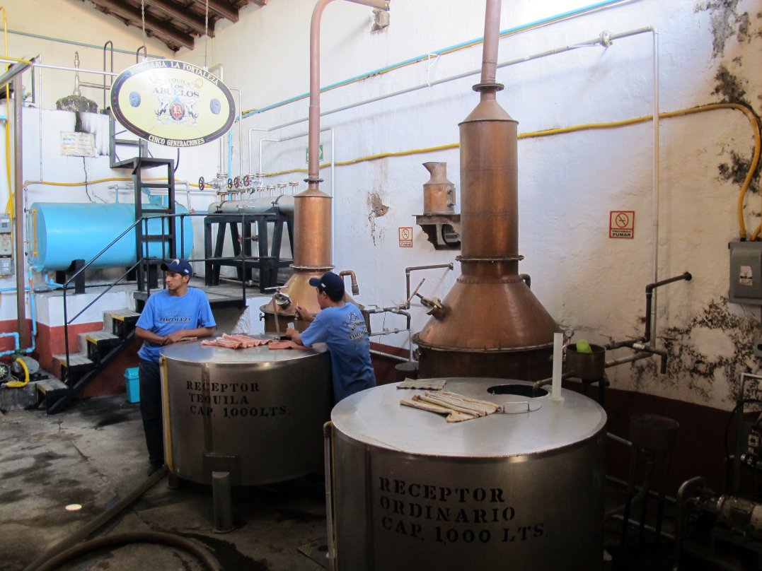 At La Cofradia they have large and small stills for the first and second/third distillations. The first, large stillas are called "destroyers" and their job is to get rid of most of the heads and tails.The resultant spirit is 22% alcohol.