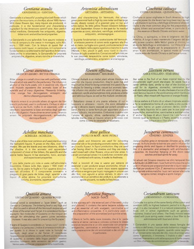 I've been studying a lot of these botanicals lately, and found the write-ups on these from the tasting room to be very good. So I'll just post them here for future reference (yours and mine). Note that there is some good information on a few of these at the Cocchi website.