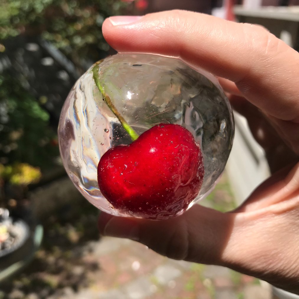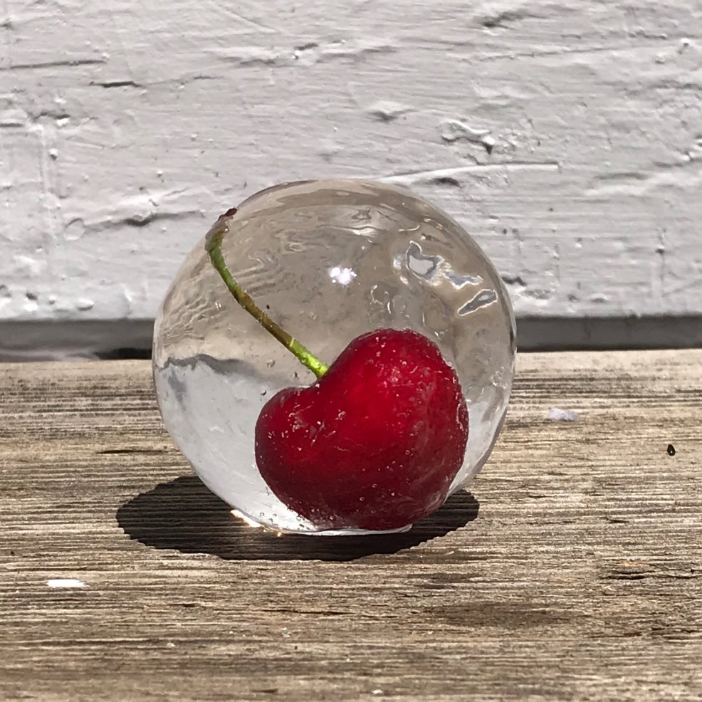 Using this technique with the Thermos Funtainer and ice ball molds I put some cherries inside ice ball molds atop the Thermos and froze them.