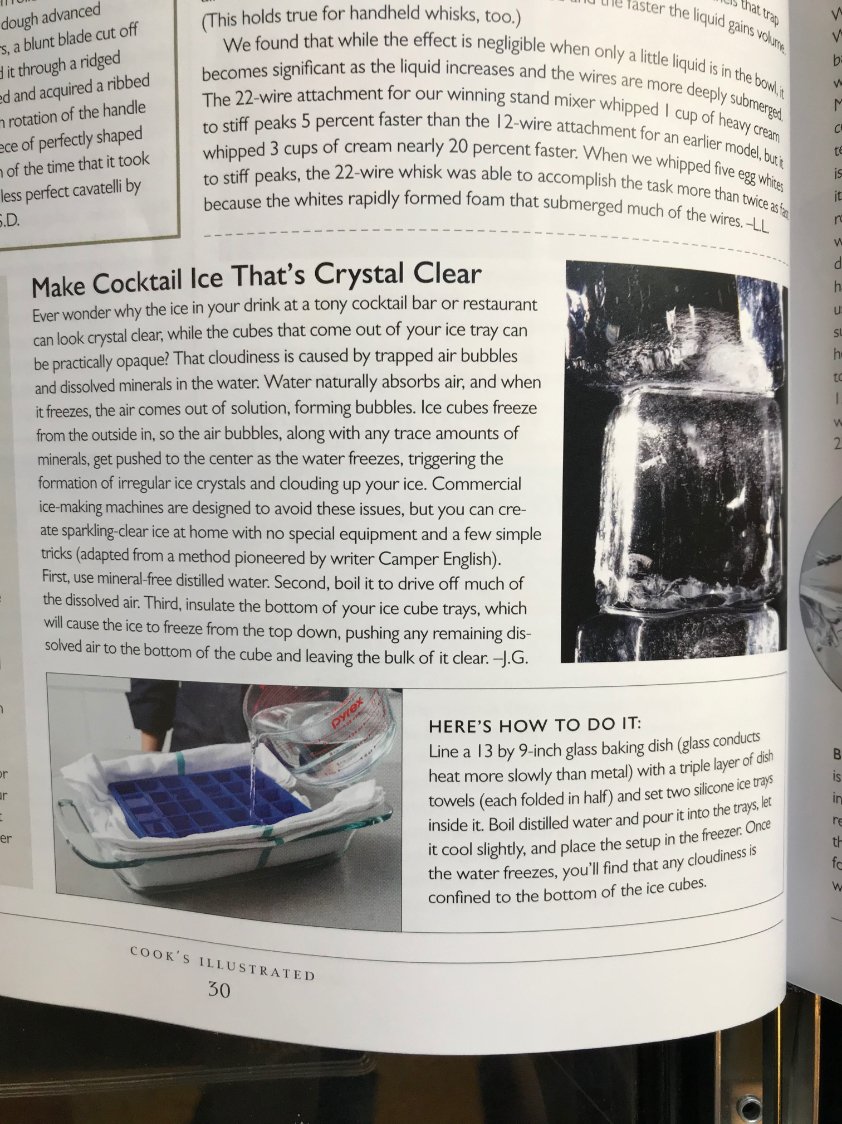 I just wanted to denote and share for posterity a mention of my clear ice process was in Cook's Illustrated in the January/February 2020 issue.