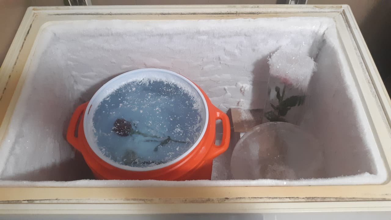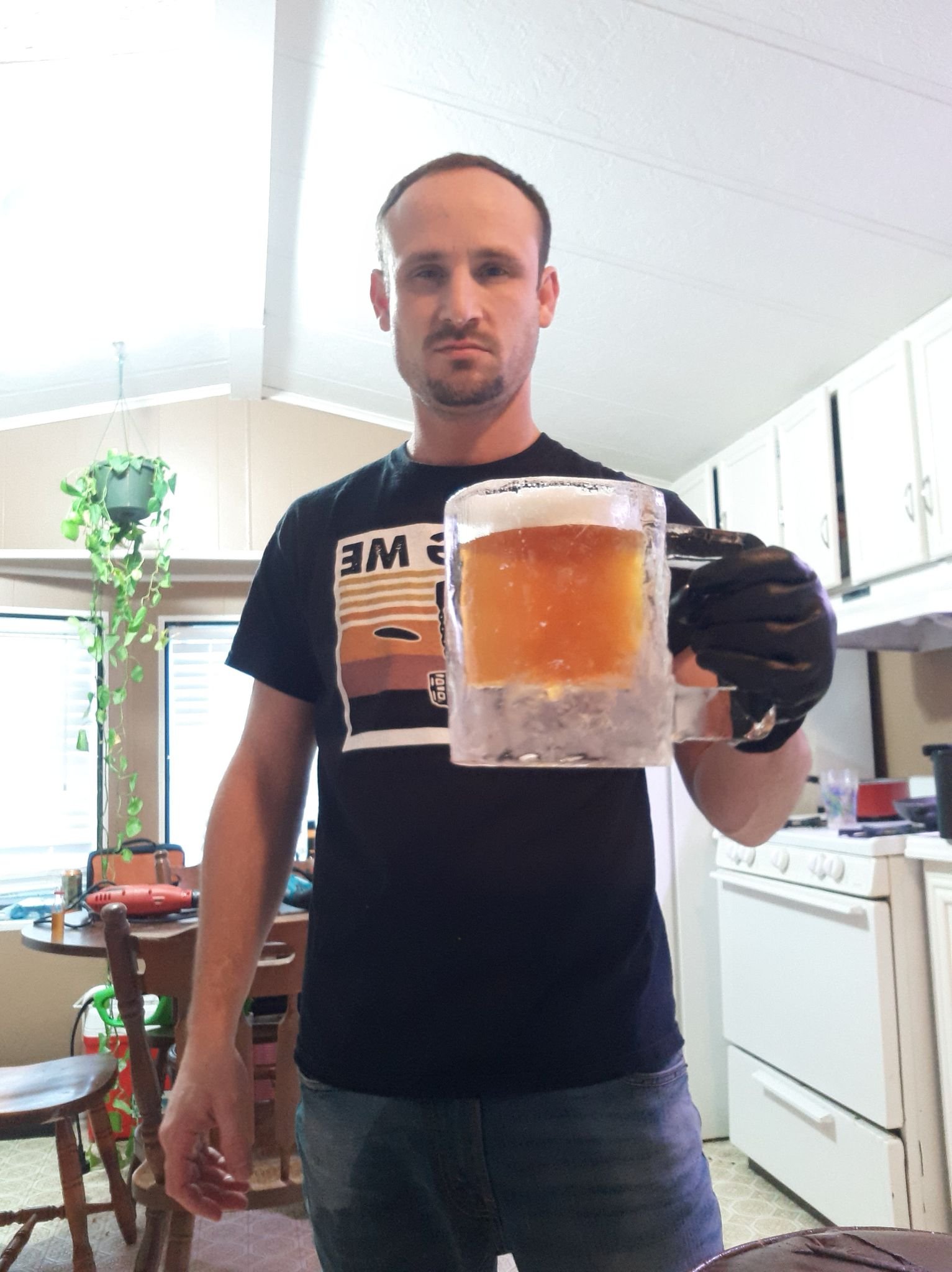 The cooler freezes from top to bottom via directional freezing, leaving him with a big round cylinder of ice to use. He then carves stuff out of it using power tools.