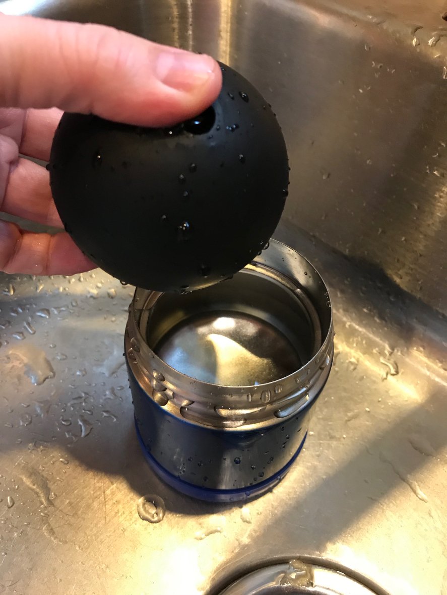 4. Put it in the freezer. The ice ball mold part will freeze first because it is not insulated. As it freezes, clear ice forms first and it will push the cloudy part of the ice down out the hole in the bottom (because it's partially insulated sitting on top) and into the thermos. The thermos should only just be starting to freeze when the ice ball on top is done freezing.