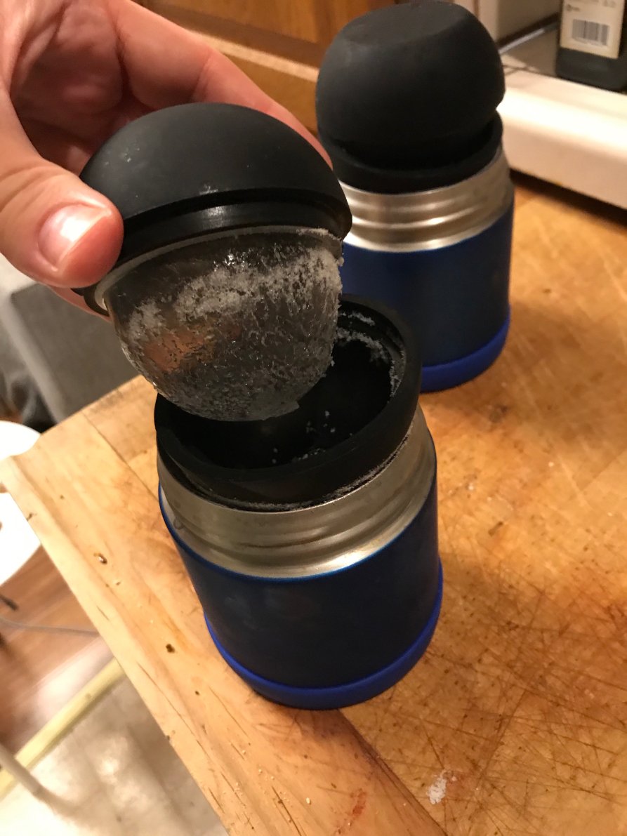 First attempt came out just okay. Compared to the control ice ball it was significantly clearer, but had a spike of cloudy ice running up the center of the sphere, from the bottom to where the plug is. Both balls were filled to the brim; the control one split the mold because of expansion, the thermos one basically shot a plume of water out the top.