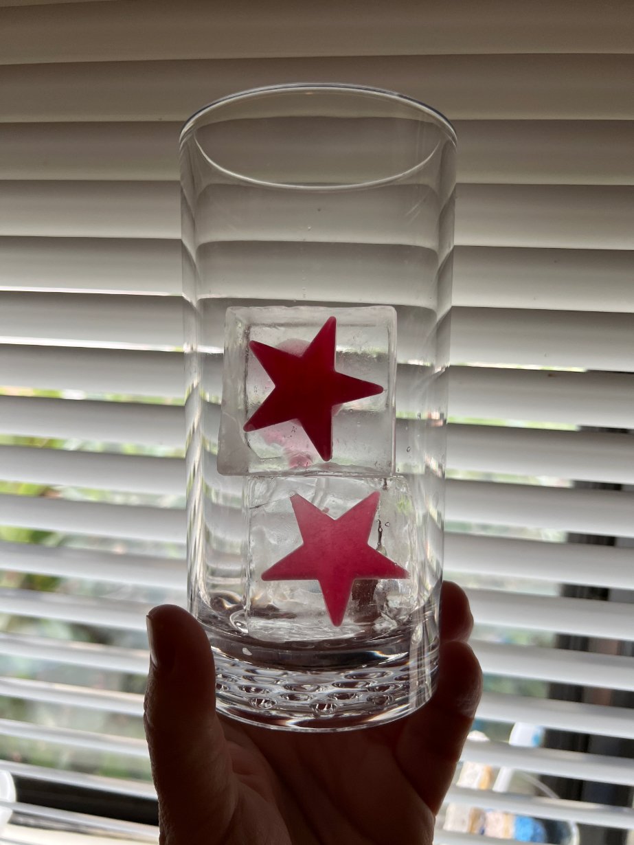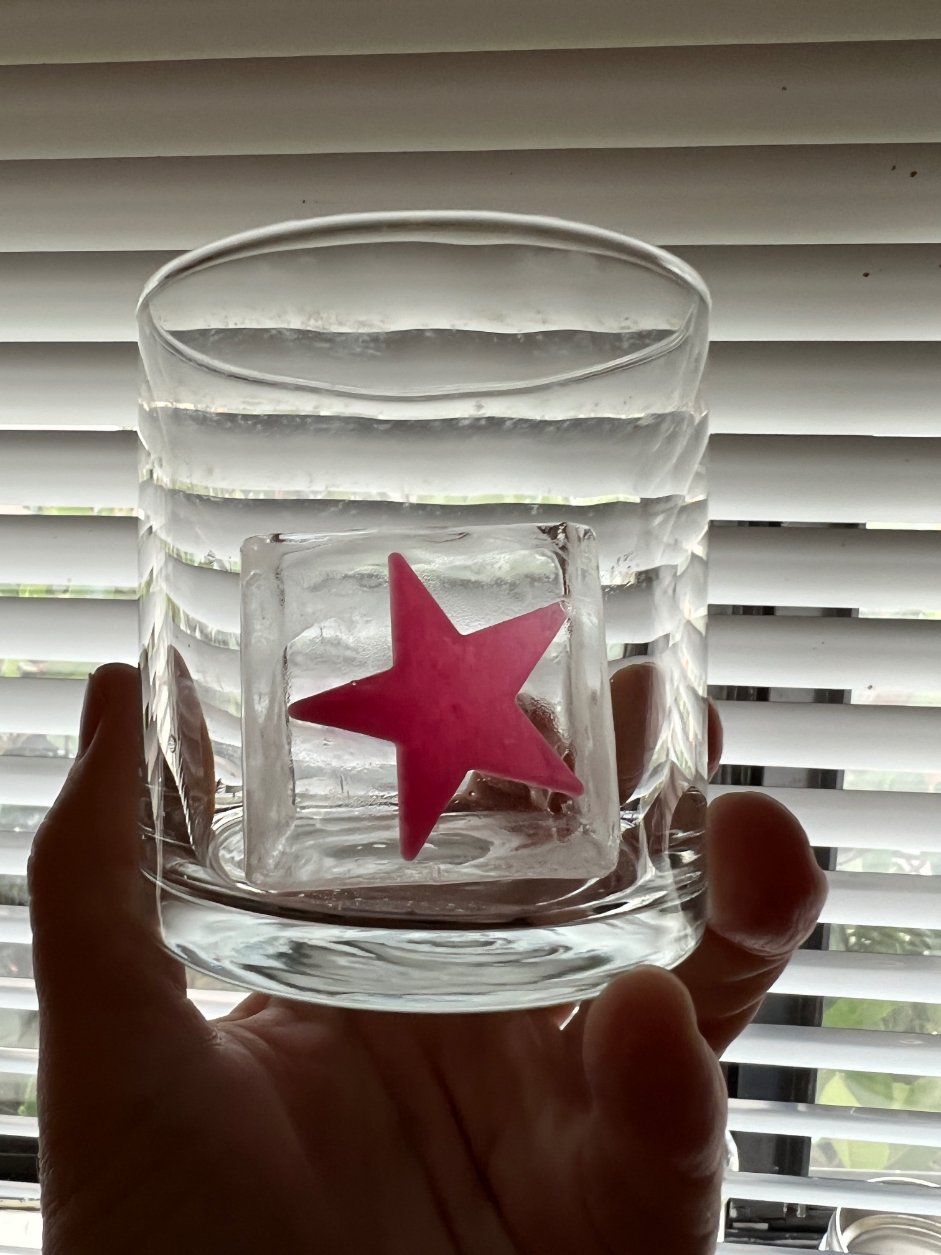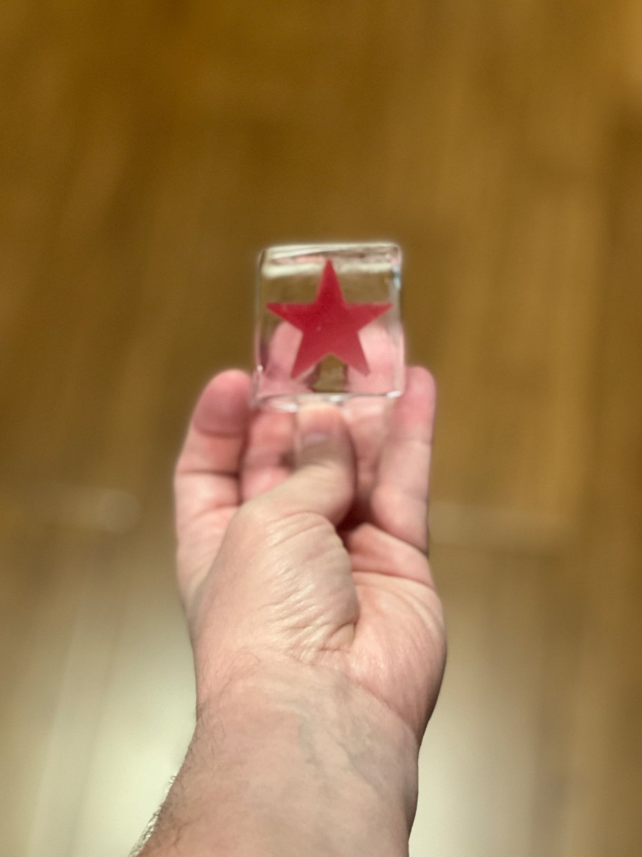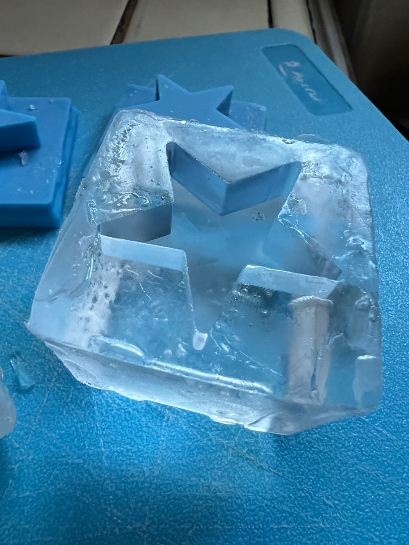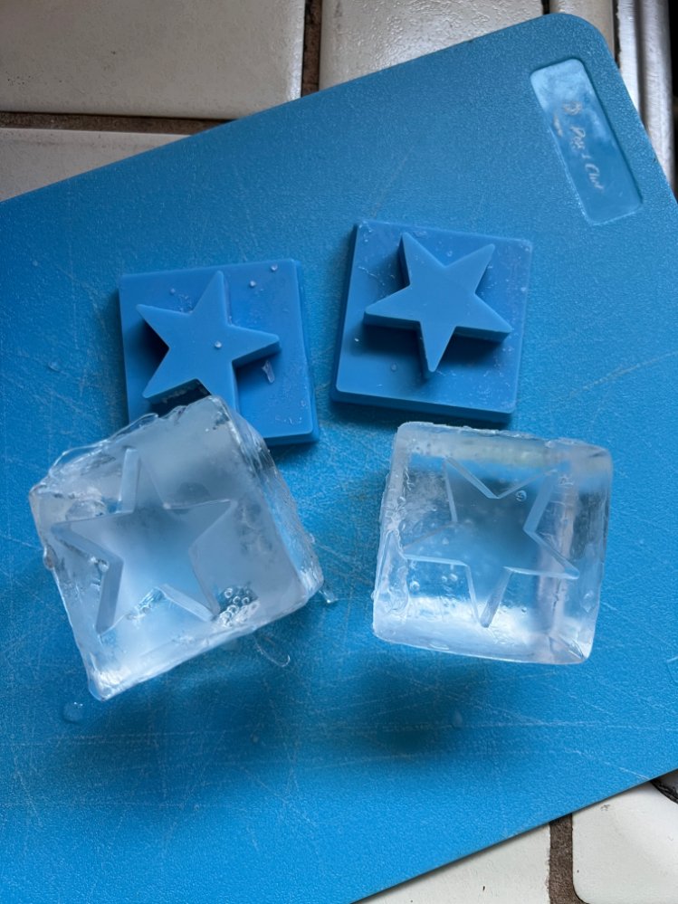 So I put them on top of my IceOlogy trays facing down so that it would press the pattern into the top of the clear cubes using directional freezing.