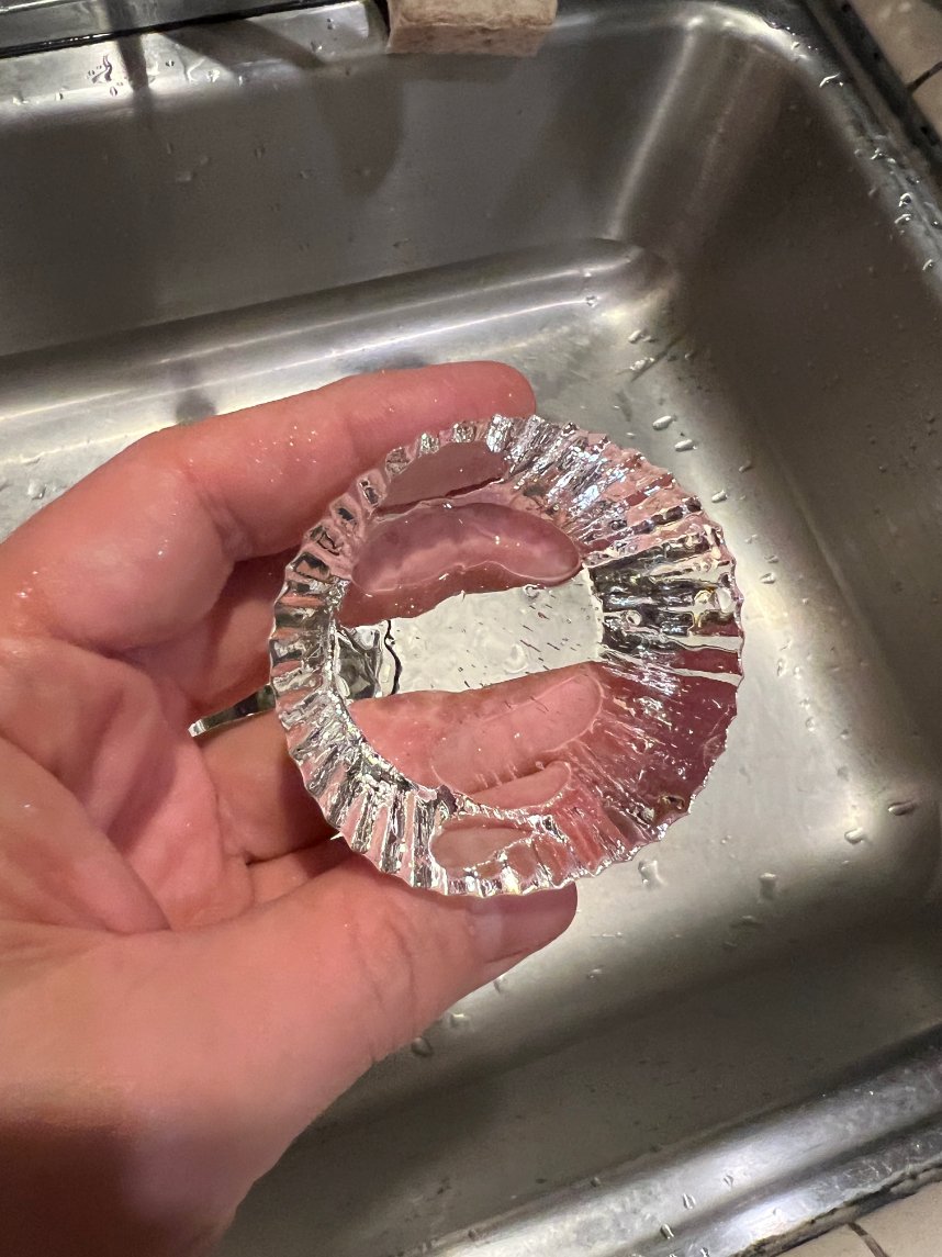 For the third block of ice, I put tap water through a Brita filter, and was generally extra careful to not introduce air by splashy pouring. (I was hoping the filtering and light handling would further reduce aeration.)