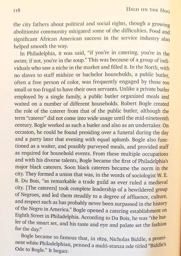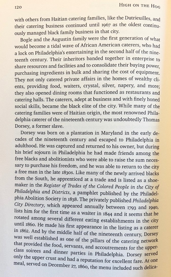 In High on the Hog, the author explains a little better why caterers were often Black businesses- coming off of domestic work skills and training but lacking the capital to open restaurants.